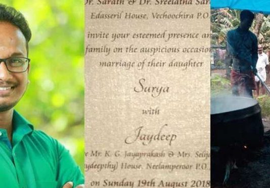 பெருவெள்ளத்தில் சிக்கி தத்தளிக்கும் கேரள மாநிலத்தில் இளைஞர் ஒருவர் ஞாயிறன்று நடக்கவிருந்த தமது திருமணத்தை நிறுத்திவிட்டு வீட்டை நிவாரண முகாமாக மாற்றியுள்ளார்.