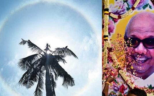 மறைந்த திமுக தலைவர் கருணாநிதிக்கு மூன்று ஒளிவட்டங்களுடன் சூரியன் அஞ்சலி செலுத்திய அதிசய நிகழ்வு நடந்துள்ளது.