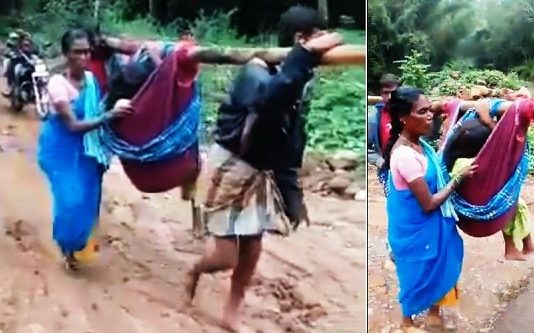 பிரசவத்திற்கு மூங்கிலில் தூக்கிச் செல்லப்பட்ட நிறைமாத கர்ப்பிணி : கலங்க வைக்கும் காட்சி!!