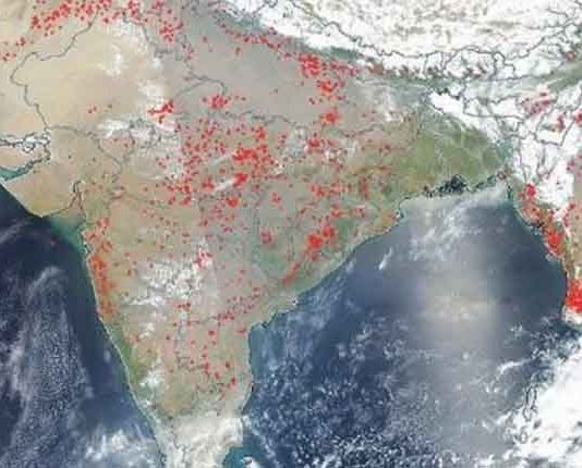 இந்தியாவின் பருவநிலை மாற்றத்தை நாசா படம்பிடித்து வெளியிட்டுள்ள நிலையில் அதிலிருக்கும் சிவப்பு நிறப் புள்ளிகள் காட்டுத் தீயாக இருக்கலாம் எனத் தெரிவிக்கப்பட்டுள்ளது.