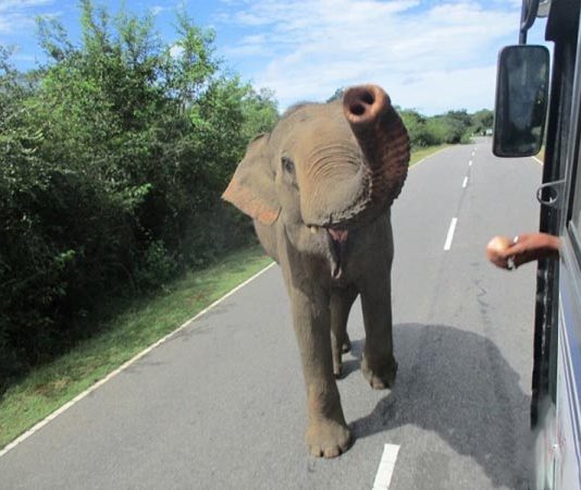 புத்தளத்திலிருந்து கதிர்காமம் செல்லும் பிரதான வீதியில் யானைகள் வழியை மறித்து நின்று, அவ்வழியே செல்வோரிடம் பழங்கள் வாங்கி உண்ணும் விநோத சம்பவம் இடம்பெறுகின்றது.