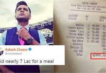 இந்திய முன்னாள் கிரிக்கெட் வீரர் ஆகாஷ் சோப்ரா மதிய உணவு மட்டும் 7 லட்ச ரூபாய்க்கு சாப்பிட்டதாக தனது டுவிட்டரில் பதிவு செய்துள்ளார்.